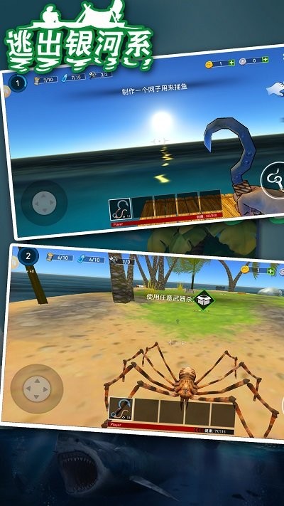 2、你只有一个破旧的木筏,搜集资源制作武器,还要和海底的鲨鱼进行斗战。