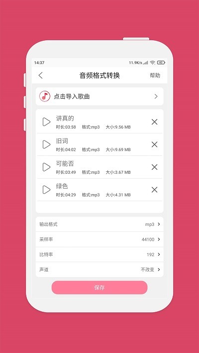 6、音频格式转换:支持mp3、AAC、AMR等主流格式音频之间的格式转换;