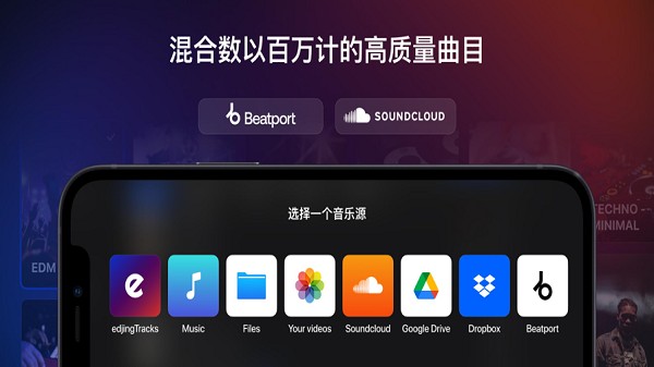 edjing mix是一款专业的DJ软件。这款软件是为了喜欢热爱DJ的朋友们设置的,是专业的DJ打碟软件,不仅可以用来播放音乐,还能进行和手动打碟。软件有专业的虚拟摇杆,交叉推杆可以实现你专业的声音过渡,能通过手动搭配匹配节拍也可以点击同步按钮来一键同步每分钟的(bpm),来进行完美过渡。着是一款成功的DJ应用,让你像一个DJ一样控制你的音乐,你的节拍,让玩家在软件里也可以体验真实的DJ玩法。这款软件让你充满快乐与激情,在这枯燥的日子尽情的释放自己,在房间享受会场般的感觉,在派对上像一个DJ一样,让你的朋友对你充满羡慕,打碟打出激情的火花,让软件来自动混搭你的播放列表吧。用户只需要自定义所需的过渡,软件便可自动bpm同步,让你的音乐节拍永不跑调,尽情播放所有喜爱的流行音乐。本次小编给大家带来的是edjing mix手机版,免费使用所有的混音功能,感兴趣的小伙伴快来下载吧。