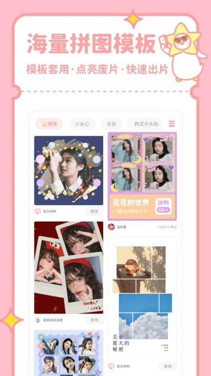 拼图鸭相机是一款页面清新可爱,温暖治愈的照片编辑app。照片编辑的功能和风格也是和它的页面一样,主要为小仙女们提供各种类型的照片风格,例如甜系、盐系、清新、高冷等等,总有一种风格能够满足你的喜好,搭配你的个性。app中还内置有由官方设计师小姐姐精心设计的原创贴纸和花字特效,配合上全面强大的编辑功能,足以让你对自己的照片进行二次创作,搭配上自己最喜欢,最符合风格的这些特效,制作出只属于自己的个性作品。还有独特的虚拟形象转化功能,让你可以跨次元的出现在现实背景的照片当中。若是你非常喜欢使用这些功能来编辑自己的照片,不满足一次只能够编辑一张,拼图鸭相机安卓版还可以将多张照片进行拼凑,在一个界面中拼接多张照片成为一个作品,而且拼接图形可以随意选择,随心调整,直到制作出你满意的作品为止,这么可爱又功能全面的app还不赶紧来下载体验吗。