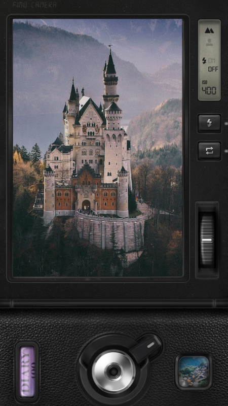 2、FIMO相机打开之后,我们会看到多年以前的相机装饰,同时也能够看到里面的功能选项,列如镜头方向切换、焦距缩放、拍摄闪光灯、图片储存库等等。