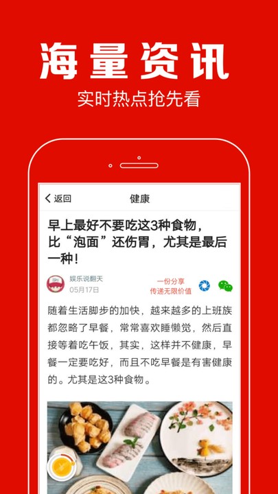 3、海量热点新闻随心阅读,养生、美食、娱乐、时尚一应俱全;