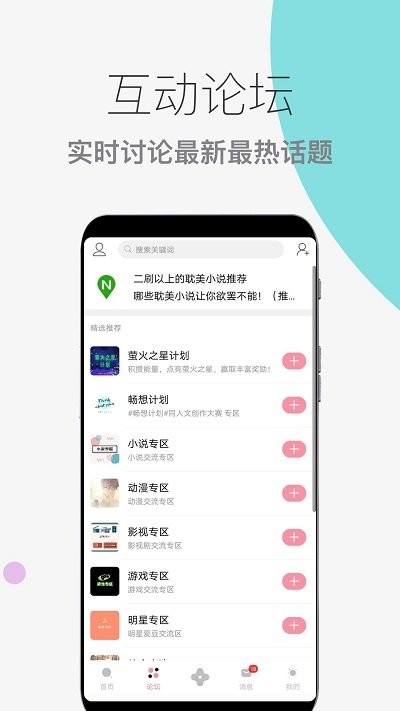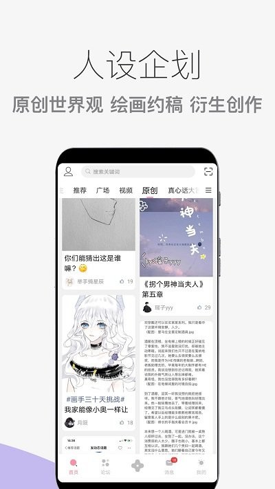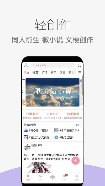 1.下载打开app点击首页下方加号,即可发布自己的同人想法贴子