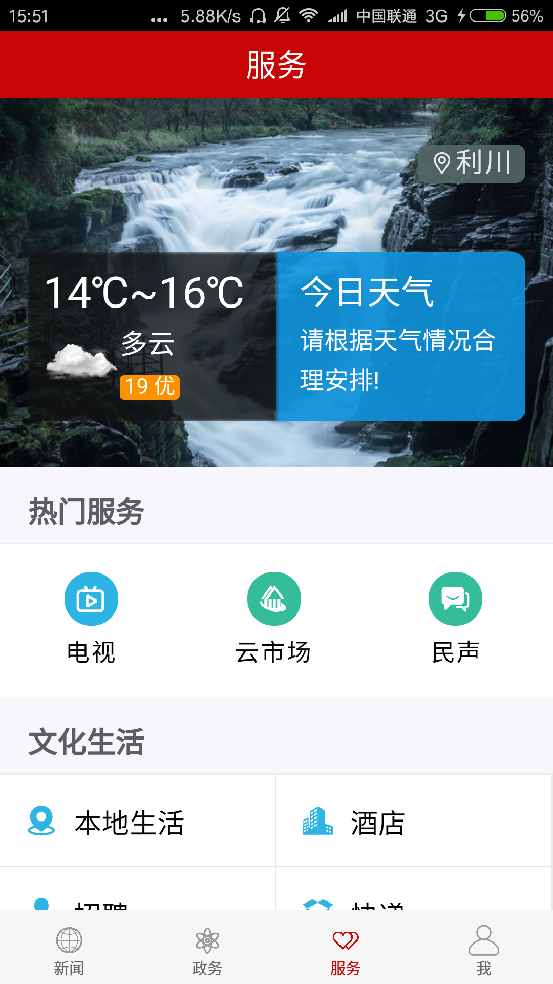 云上利川app是一款非常实用的生活服务软件,该软件将政务服务、新闻阅读和生活服务结合在一起,简直就是为利川用户量身定做的手机软件。通过这款软件用户可以更好的了解到最新的新闻信息,让你实时关注有趣的新闻头条,足不出户就知天下事。该软件还支持收看电视节目,当你不想打开电视的话,你使用手机也可以随时收看,吧手机当电视用,非常的方便。用户可以在这里预定同城的酒店,让你在出门在外的时候也有一个落脚的地方,云上利川最新版为你的出行简直就是操碎了心,本地的天气预报为你实时提醒,让你可以了解到每一天的天气情况,给你的生活带来了诸多的便利和乐趣,有兴趣的小伙伴可以前来本站下载体验一下。
