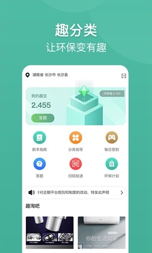 你是不是还不知道有些垃圾是什么种类的呢,为了让你更加的进行垃圾分类,这里就为你带来了一款非常好用的软件:趣分类app,这款软件将答题、游戏、扫码投递、分类指导、商城等功能结合在了一起,这样就可以更好的体验其中的功能,用户可以通过这款软件学习到更多的垃圾分类知识,为了让更多的用户学习到垃圾分类知识,软件还为用户推出了答题赚钱的功能,简直好用到不要不要的,让你从根源上解决垃圾污染问题,保护好自己赖以生存的自然环境,海量题库让你随意做题,对了就有一定的奖励,你可以通过奖励兑换自己喜欢的商品,为了让你有一个更好的环境的话就来本站下载这款趣分类安卓版吧,让我们一起行动起来。