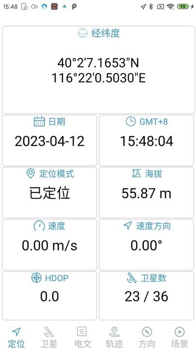 6、可查看手机定位模块提供的定位模式、经纬度、高度、速度、速度方向、HDOP、卫星数、卫星分布、卫星信号强度等信息;