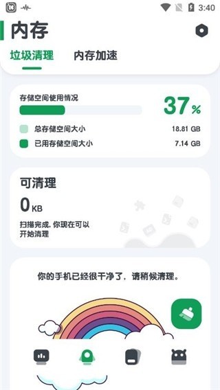 简洁强大的垃圾清理功能,清理手机内部的:系统垃圾、应用垃圾、无用安装包、卸载残留文件、广告文件。