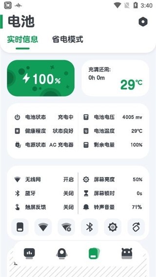 监测电池的温度和历史使用情况,实时展示电池使用状态,包括:电池健康程度、充放电状态、电压、剩余电量、温度等。
