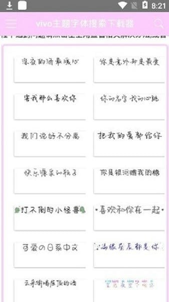 小海主题字体是一款即能够更换主题壁纸也可以更换字体内饰的工具。该软件每天都会有将热门的主题壁纸资源和字体装饰资源推送到各自的区域,而且两种不同的资源各自也有着丰富多种的类型区别,列如主题资源,在该区域中资源分类拥有动漫主题、明星主题、景区风景主题、萌宠主题等等,每个类型主题中都拥有着大量的资源,当然如果小伙伴们不想一个个寻找的话,也可以点击推荐区域这里每天会推送最热门的主题壁纸,如果喜欢就可以直接下载使用,非常方便。所以这次小编带给大家地是这一款小海主题字体最新版它拥有繁多的字体样式可爱的、刚毅的、软美的,有句话不是常说一个人的性格往往从他写的字就能看个大概,虽然现在以及很少有人使用写信的方式交流了,但是根据自己性格选择的字体样式同样也能够代表自己的性格。对这款软件感兴趣的小伙伴,欢迎大家下载体验。