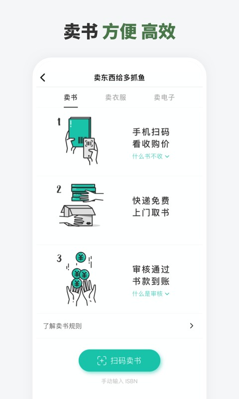 有闲置书籍要处理?在多抓鱼内直接扫描图书 isbn 码,即时查看书籍收购价。下单后免费上门取书,软件收到书并审核通过后,即刻打款,方便无负担。