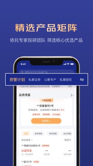 软件针对高净值客户财富规划和财富目标多元化目标,臻选资管计划、私募基金、私募股权等各类产品,更有独家白条ABS优质资产。