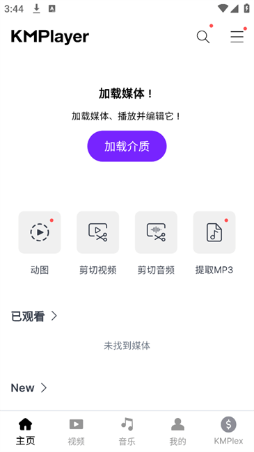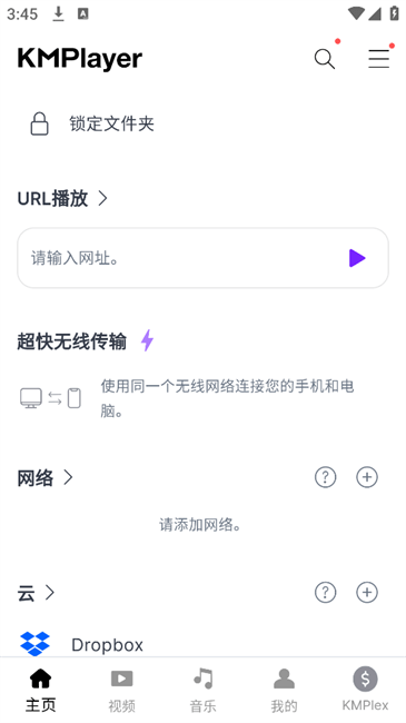 2、打开软件之后,会直接进入KMPlayer主页面这时我们可以看到四个主要功能选项,分别是主页选项、视频选项、音乐选项、我的选项。