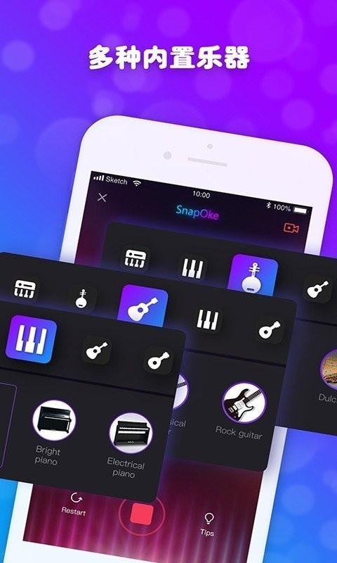 2、集钢琴、吉他、架子鼓等多种乐器伴奏功能于一体的音乐弹唱软件;