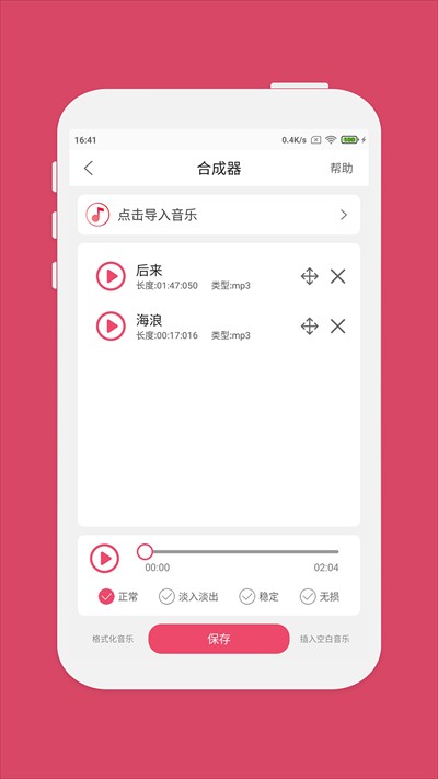 4、音频合并:各类音频,无缝合拼接合成,编辑自己喜爱的音频铃声MP3。
