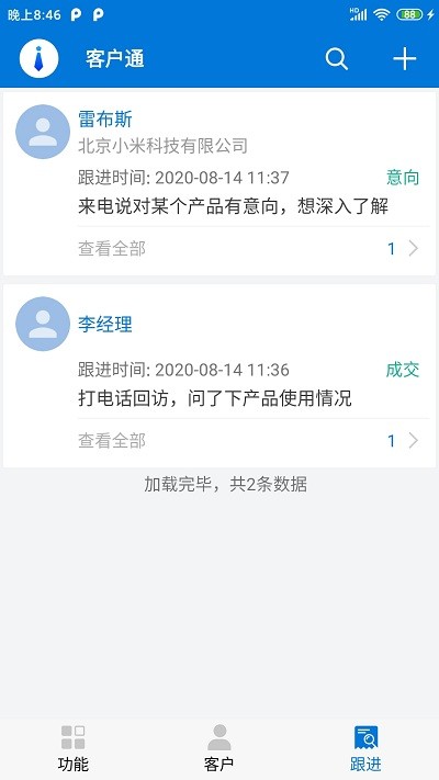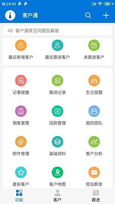 客户通是一款可以更好的管理客户关系的服务平台,软件可以在各种职场使用,更合适从业市场销售、业务流程、客户管理等有关的工作人员,为市场销售提供最方便的服务平台,工作中更成功,也随时可以掌握客户的情况,在管理上不会再有啥问题,还可以备份数据,用来保存最关键的数据信息和文档,为用户提升了保障,不会再担心客户信息内容的丢失,在换机登录的时候,恢复备份数据就可以直接应用,多用途,可以导入、导出Excel表格,为用户给予了很多省时省力的办公方法,使用户可以轻松处理办公问题,更有效地进行对应的工作。有需要这款客户通免费版的用户可以免费下载体验一下!