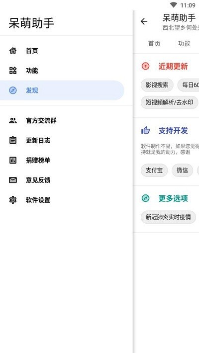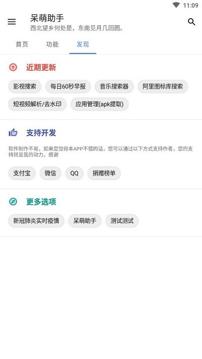 2、呆萌助手运行之后我们将能够看到多个功能选项,列如首页功能、功能选项、发现选项等。