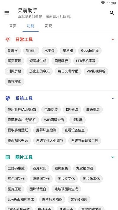 呆萌助手提供了与文字、图片、设备、清理、文件、计算、查询、相关的100多种工具,基本满足您在日常使用手机时的所有工具需求。
