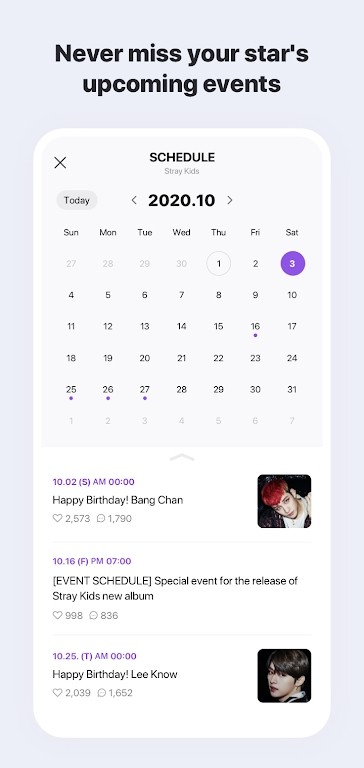 可提前在V中确认即将播放的明星直播日程。若您不想错过明星的直播放送,请记得确认节目播放日程表,快设定通知功能吧!