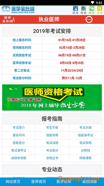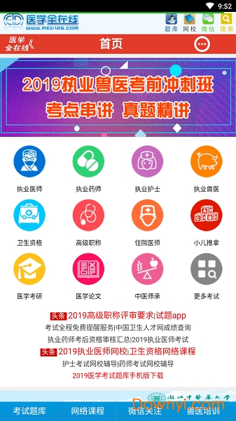 医学全在先拥有丰富而全面的考试资源,APP涵盖执业医师、执业护士、卫生资格、医学职称、住院医师、执业兽医、等多种医学考试内容,每天都有实时的考试资讯为你呈现。