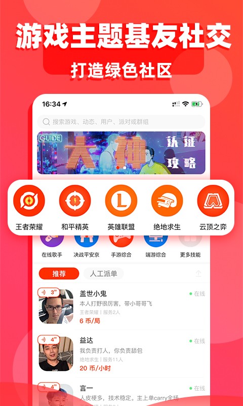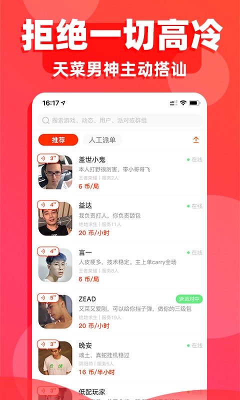 「人工派单」近期还会在晚上20~02点推出人工派单厅,大家可以语音和主持人咨询,为你匹配符合要求的大神。