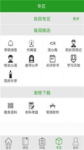 专区部分:主要是学院的新闻信息和教务资料披露,比如新闻动态、代祷室、好书推荐、学生分享等。
