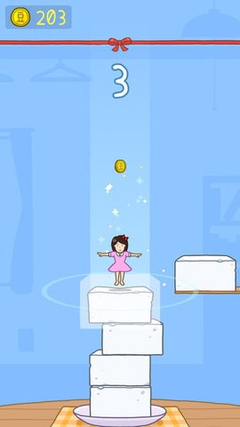 2、动动手指,轻松上手。点击屏幕进行跳跃,让女孩稳稳落到豆腐上,美妙的心情和女孩跳动的节奏一起,向完美跳跃和更高的分数挑战吧!