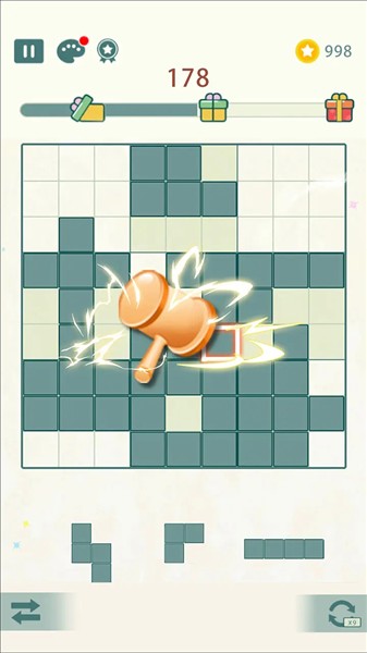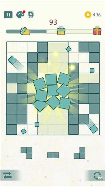 2、经典七巧板玩法,将方块拖入棋盘中拼接消除,消除特效华丽炫酷,闪爆你的眼球。