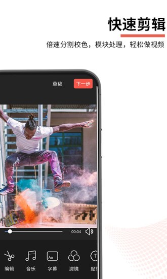 6、强悍制作百余种精选字体、数十种炫酷样式、描边、大小、颜色等可随意组成数万种字幕,配合闪黑、闪白、淡出淡入、层叠等几十种电影级转场,还有TOMO、补光、兰桂坊、冰淇淋、ins、BlackM等数百种专业滤镜,形成独特的视觉穿透力!拥有媲美PC端水准的视频后期能力,满足专业剪辑师的需求。
