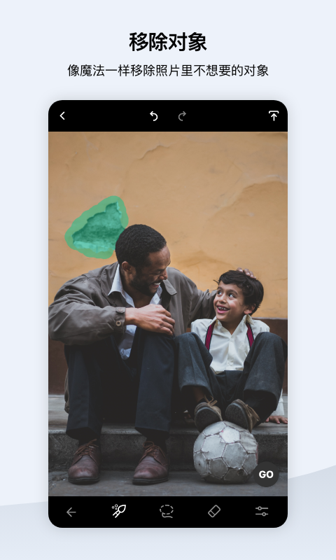 用删除物体工具去除照片上的干扰物——选择刷子或套索工具,标记想要删除的内容,然后点击Go按钮。