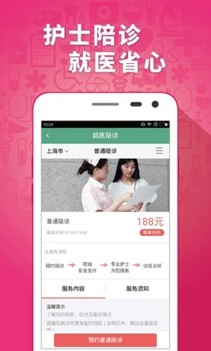 6、诊疗陪诊:技术专业的护理人员陪你申请办理诊疗手续;