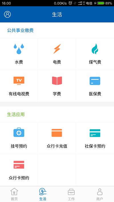 3、公共事业缴费:水、电、煤、有线电视、医保、学费等在线缴纳。