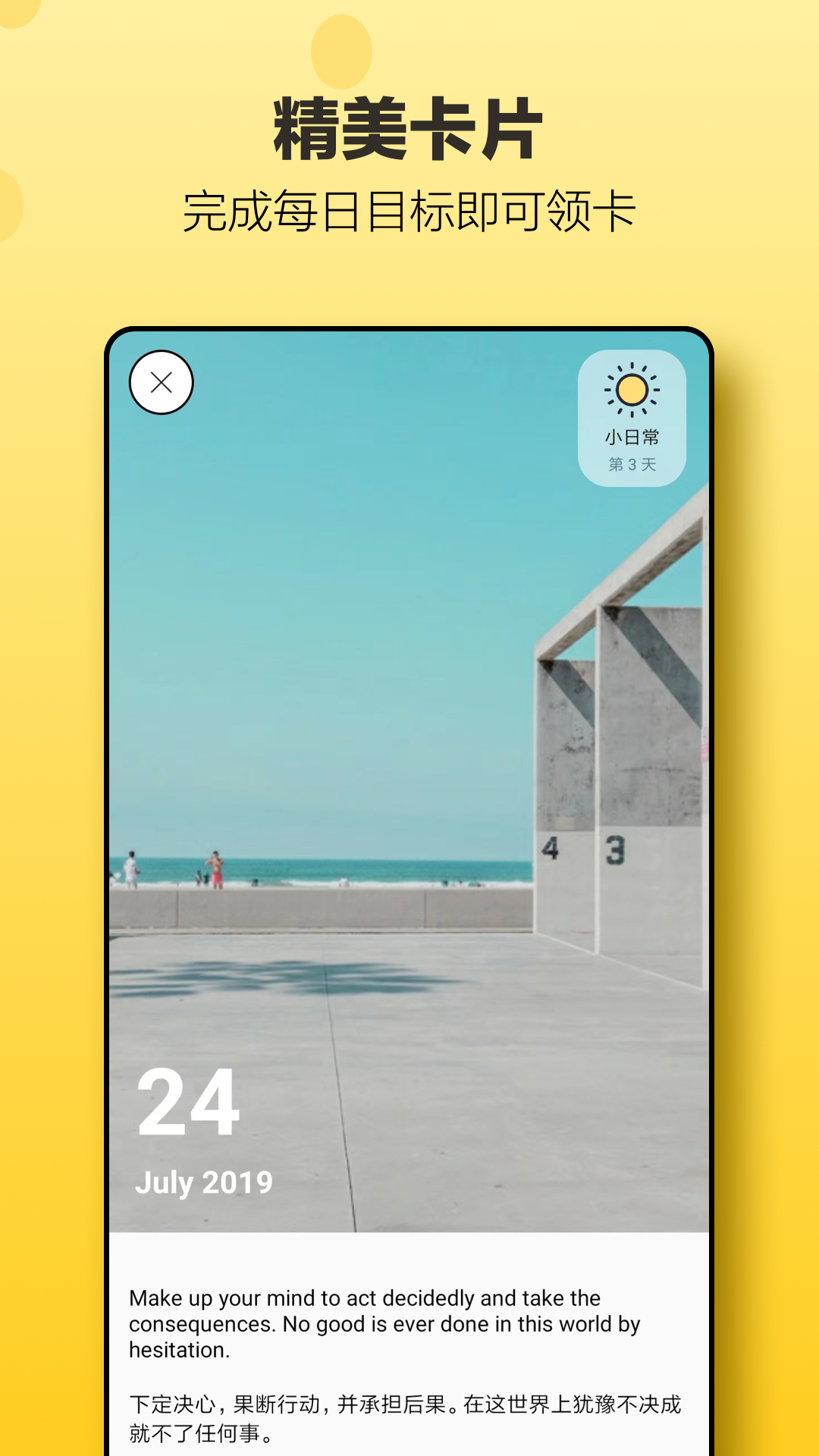 1、小日常每天都会推送一张卡片,当今天所有习惯都完成之后即可获得该卡片,并收藏起来。您可以在卡片的背面记录该日的感想,激励自己;