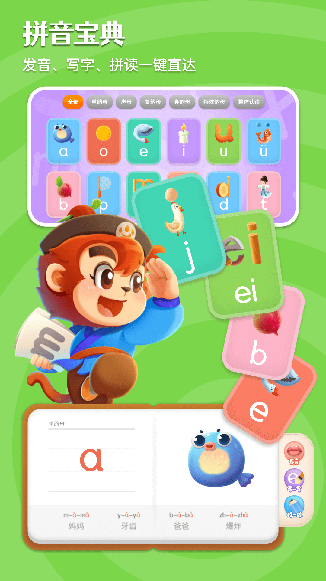 3.悟空拼音是一款专门为学龄前儿童开发的拼音学习软件。