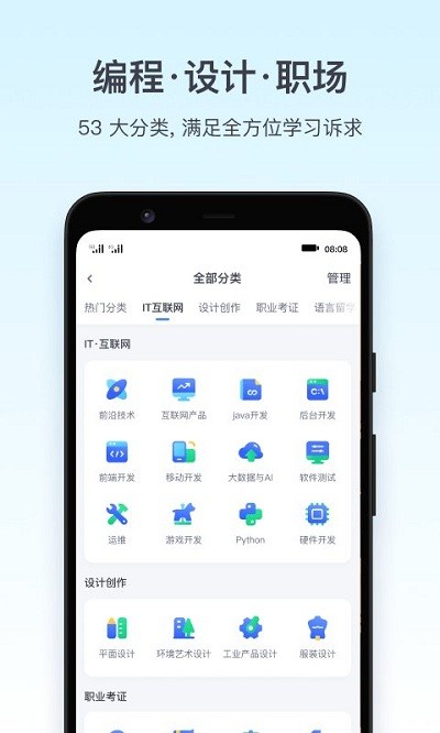 4.设计,课堂app涵盖UI设计、室内设计、游戏美术设计、平面设计、插画动漫等课程,更有著名机构BIGD大梦想远程培训、H2学院、拓者设计学院等。