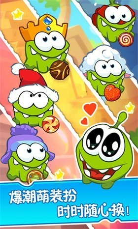 在游戏中最大的改变,就是新增了五个小怪物。会飞的小怪物—Roto,有着像直升机的翅膀,可以把碰到它的物体吊起来延曲线移动。还有可以吐舌头的小怪物Lick,吐出长长的舌头黏住障碍物,在空中铺出一条道路辅助过关。还有弹簧形状的Toss和调皮捣蛋的Boo,这些小怪兽们在游戏中都扮演着重要的角色,没有他们,OmNom就吃不到糖果了。