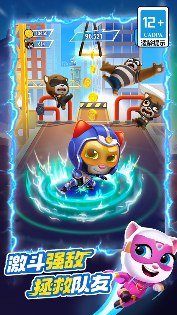 汤姆猫英雄跑酷是一款跑酷竞速类手游,说到跑酷游戏相信很多玩家第一时间想到的就是神庙逃亡了,不过这款游戏可不是让你去逃跑,而是反过来追击那些在城市之间捣乱的小浣熊们,在这个游戏世界中我们将要作为超级英雄来守护城市的和平安定,而超级英雄的角色也是大家非常熟悉的会说话的汤姆和他的好伙伴安吉拉,你可以选择任意一个角色开始自己的跑酷之旅。虽然汤姆猫英雄跑酷国服的核心玩法还是跑酷,但也有很多独特的设定玩法,例如在抓获小浣熊的同时还要解救那些被其绑架的家族同类们,让他们重获自由,玩腻了跑酷还可以去特殊的摩托艇玩法里体验一把极速飞驰的感觉,让那些作恶的小浣熊无处遁形,在抓获了一定数量的小浣熊后还会获得一些特殊的奖励哦。