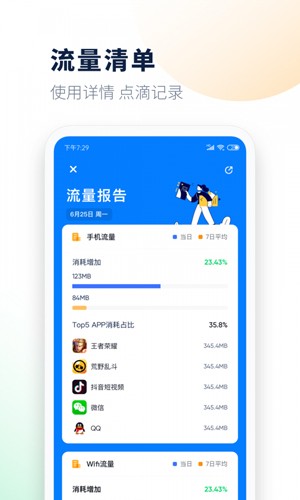 2、监测手机应用程序流量消耗情况,帮助你关闭耗量大的程序。