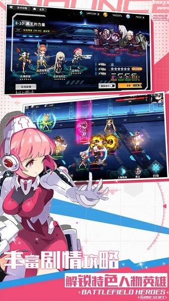 战场英雄物语是由Alioth自主研发的一款以二次元为题材的角色扮演类SRPG手游,个性的日系Q版画风,充满机械感的游戏画面,激烈的战斗场面,辅以酷炫的技能特效和多样的系统设定,更有专属武器、装备打造、战斗回路、强敌入侵等众多新颖玩法,将带给玩家更具独树一帜的游戏体验。游戏的故事背景讲述的是为了维护世界的和平,坚持爱与正义的少年们屹立大地之上,与妄图毁灭世界的恐怖分子展开了殊死搏斗,不仅仅是只有少年们,还有美少女战士们他们一起为维护世界的和平为战斗;游戏的玩法很简单,玩家将在这个游戏世界中需要通过完成故事剧情和关卡挑战,不断地解锁新的英雄,而且每个英雄都拥有自己的专属武器和装备,玩家将和这些英雄少年、少女一起为这个世界的和平出一份自己的力气。