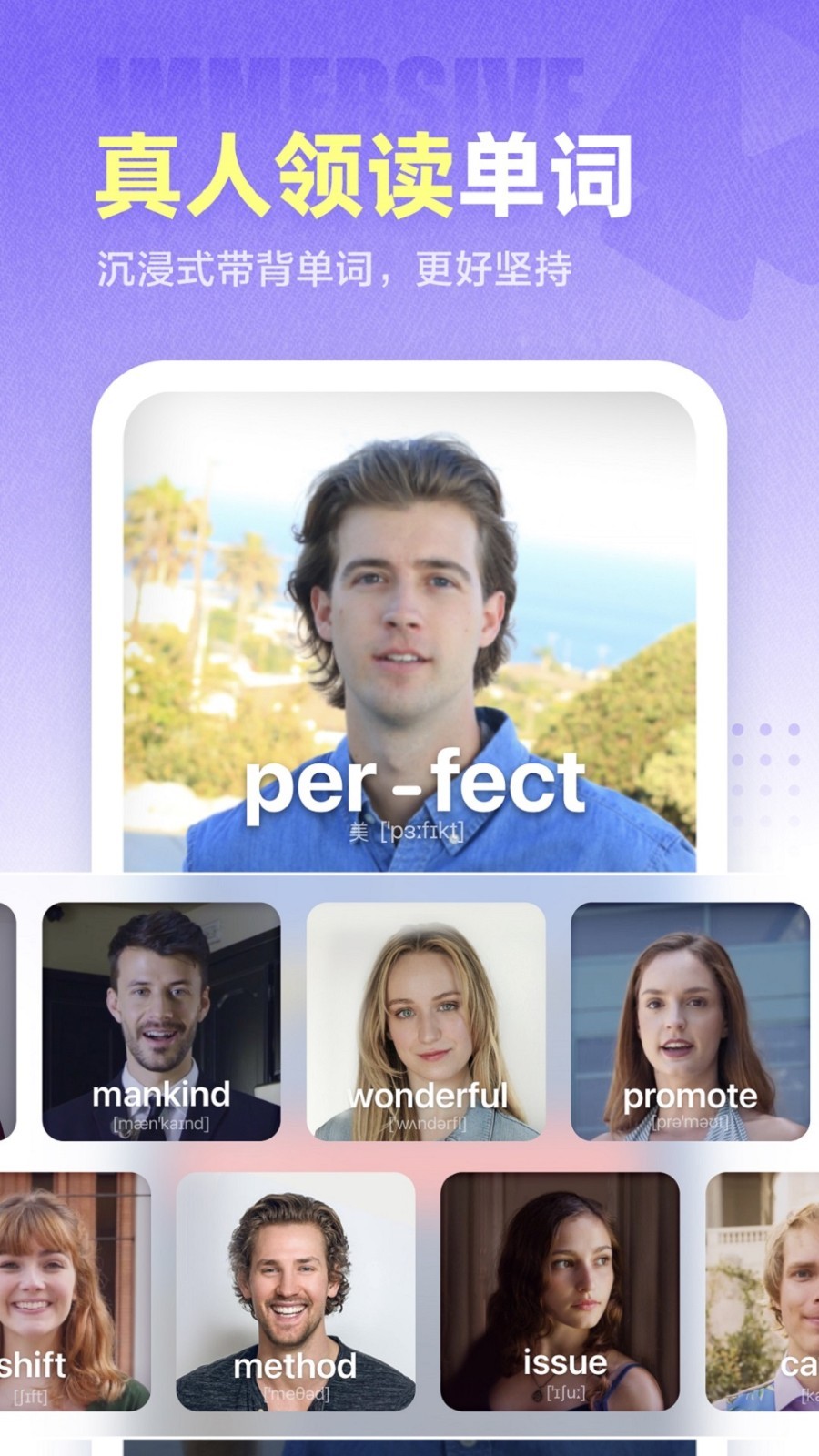 真人纠音(单词、例句智能评分并帮你纠正发音)、随身听(支持单词拼读)