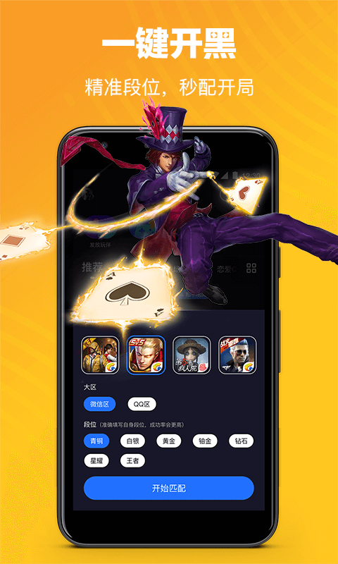 软件内置匹配功能,能够让你一键匹配到技术高超的游戏大神,让他们陪你一起开黑、一起聊天,一起上分,冲击最强王者。