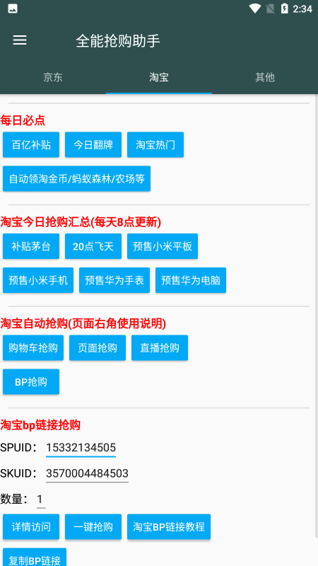 1、支持京东、淘宝bp链接生成和抢购。