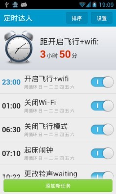 定时达人app是一款完全免费的手机上定时软件,给予定时、闹铃、照相、录音等功能。APP可以定时执行手机的绝大多数实际操作,可以随意设定循环系统,功能十分强劲。例如可以定期发信息、通电话、闹铃等。,这也是懒人必不可少的设备之一。客户可以随意拆换手机壁纸,设置铃声。每日何时干什么,生活节奏感打乱该怎么办?快来下载定时达人最新版吧,可以迅速帮你纪录每一个独特的日子和时间,让生活轻轻松松开心。!适用飞行模式、仿真模拟手势、电话、短消息、照片、录音、待机、重新启动、内存优化等好用功能的定期实行。功能随意设定,每日任务交叉互换,循环系统方法随意选择,通用性按时优秀人才,精彩纷呈的东西需要您自己去发现!