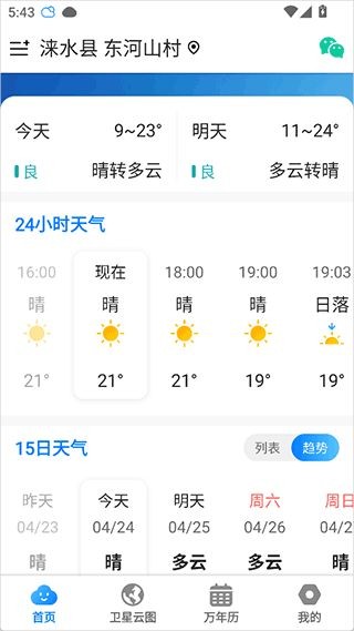 提供每小时精细化天气预报,方便用户掌握 24 小时内天气的细微变化,提前应对昼夜温差过大可能带来的影响,做好保暖或降温准备;
