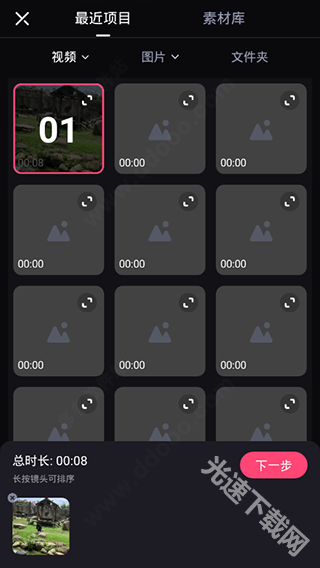 2、点击剪辑即可开启选择需要剪辑的素材,并支持选择多个素材内容;