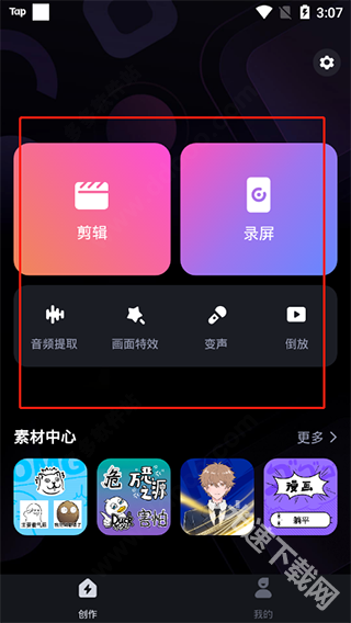 1、打开必剪即可看到提供了剪辑、录屏、音频提取、画面特效、变声、倒放、素材等功能;