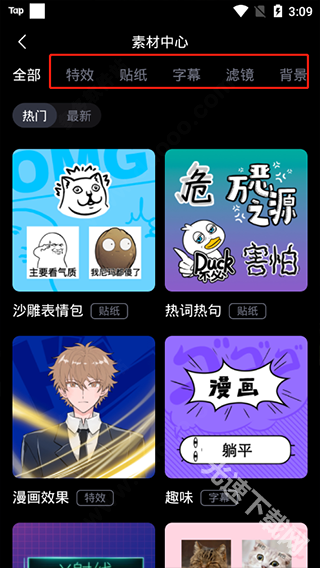 6、另外在必剪app的素材中心也为用户们提供了特效、贴纸、字幕、滤镜、背景、转场等海量内容。