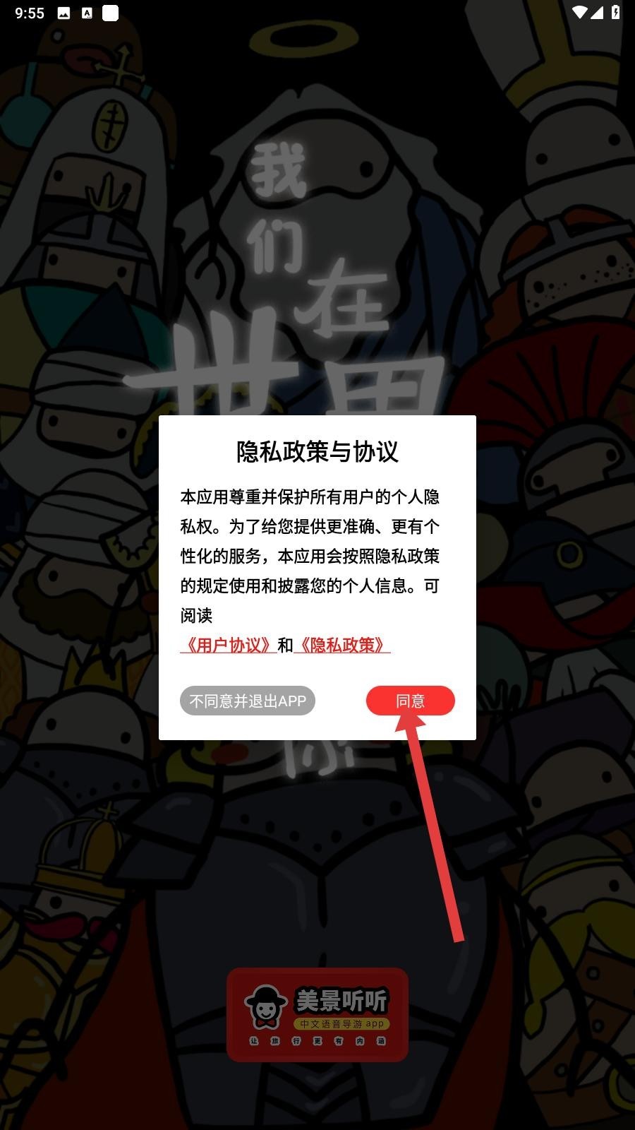 1、打开美景听听,点击底部我的,在个人页点左上角登录,弹出隐私政策与协议框,点同意进入登录流程。