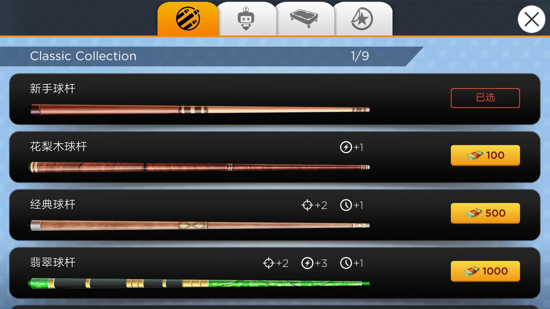 3、在对战开始前,我们可以选择好球杆、巧克粉、球桌和图标等相应的道具,
