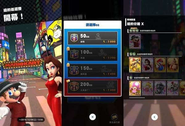 杯赛以四关为一个赛事,分为50cc、100cc、150cc及200cc四个难度,亦有期间限定的活动关卡,不时更新够新鲜感;此外,本集是以抽卡形式获得角色、车辆及滑翔翼,而组合选择是一个致胜关键,譬如不同角色于不同杯赛有不同加成,会直接影响从「?」宝箱里获得的道具数量。