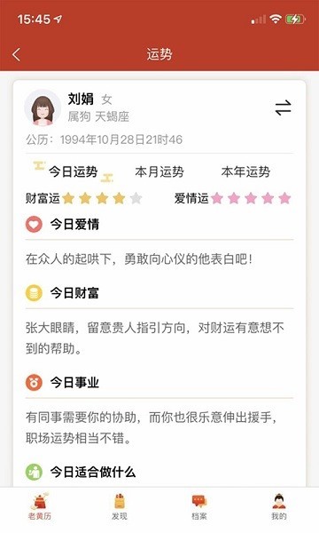 个人运势:通过用户输入自己的姓名、性别、生辰八字,为用户计算属于自己的每日、每周运势。